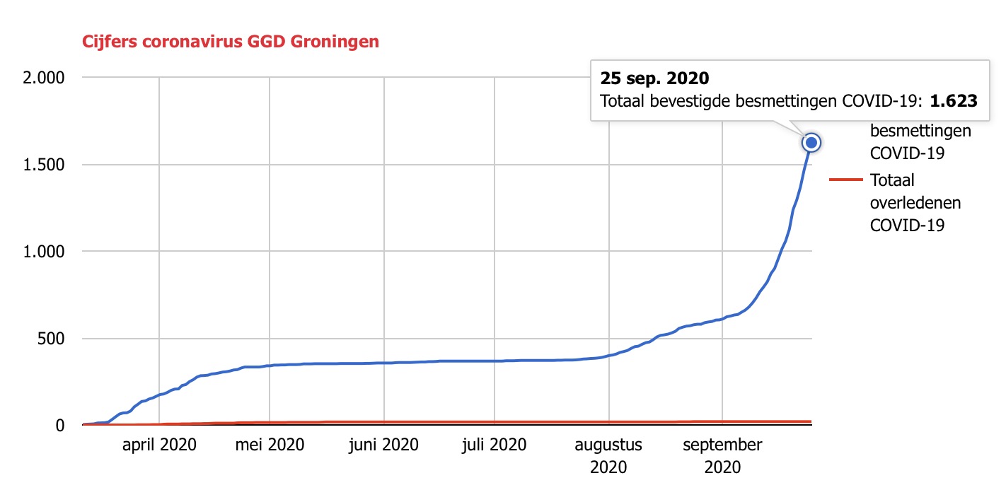 GGD-directeur Jos Rietveld liet weten dat het aantal positieve testen in de provincie Groningen nu over de 1600 is gegaan. "In juni zaten we nog op 300. Zeker sinds september is de toename enorm geweest", zegt hij. Rietveld laat weten dat de helft van de besmettingen in de thuissituatie plaatsvindt, vaak ook in studentenhuizen. In 35 procent van de gevallen vindt de besmetting plaats in de horeca of bij samenkomsten of sociale aangelegenheden.