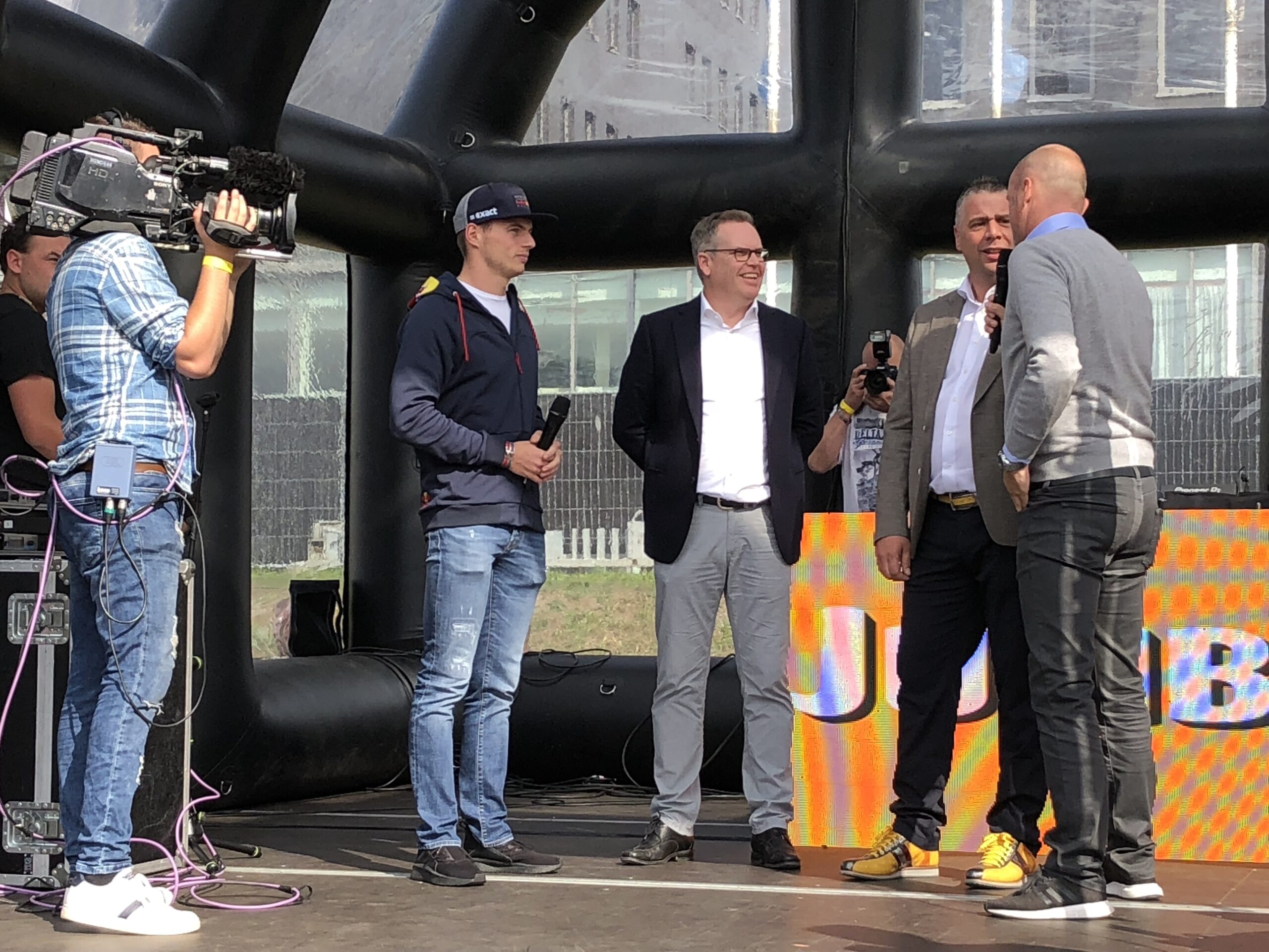 Verstappen werd op het podium geinterviewd en reed twee rondjes in een simulator. Hij was binnen een half uurtje ook weer weg, maar dat deerde de fans niet. Max is de status van superster bijna voorbij. Slechts hem van dichtbij zien is voor velen al genoeg.