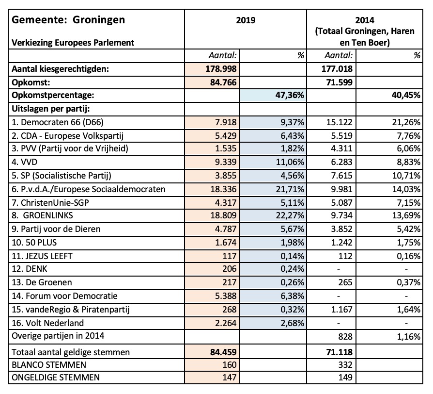 De definitieve opkomst voor de Europees parlementsverkiezing in de gemeente Groningen bedraagt 47,4%. Dat is veel hoger dan in 2014, toen de uitkomst uitkwam op 40,45 procent (inclusief opkomst in Haren en Ten Boer). In de gemeente Groningen mochten dit jaar 178.998 mensen hun stem uitbrengen.
