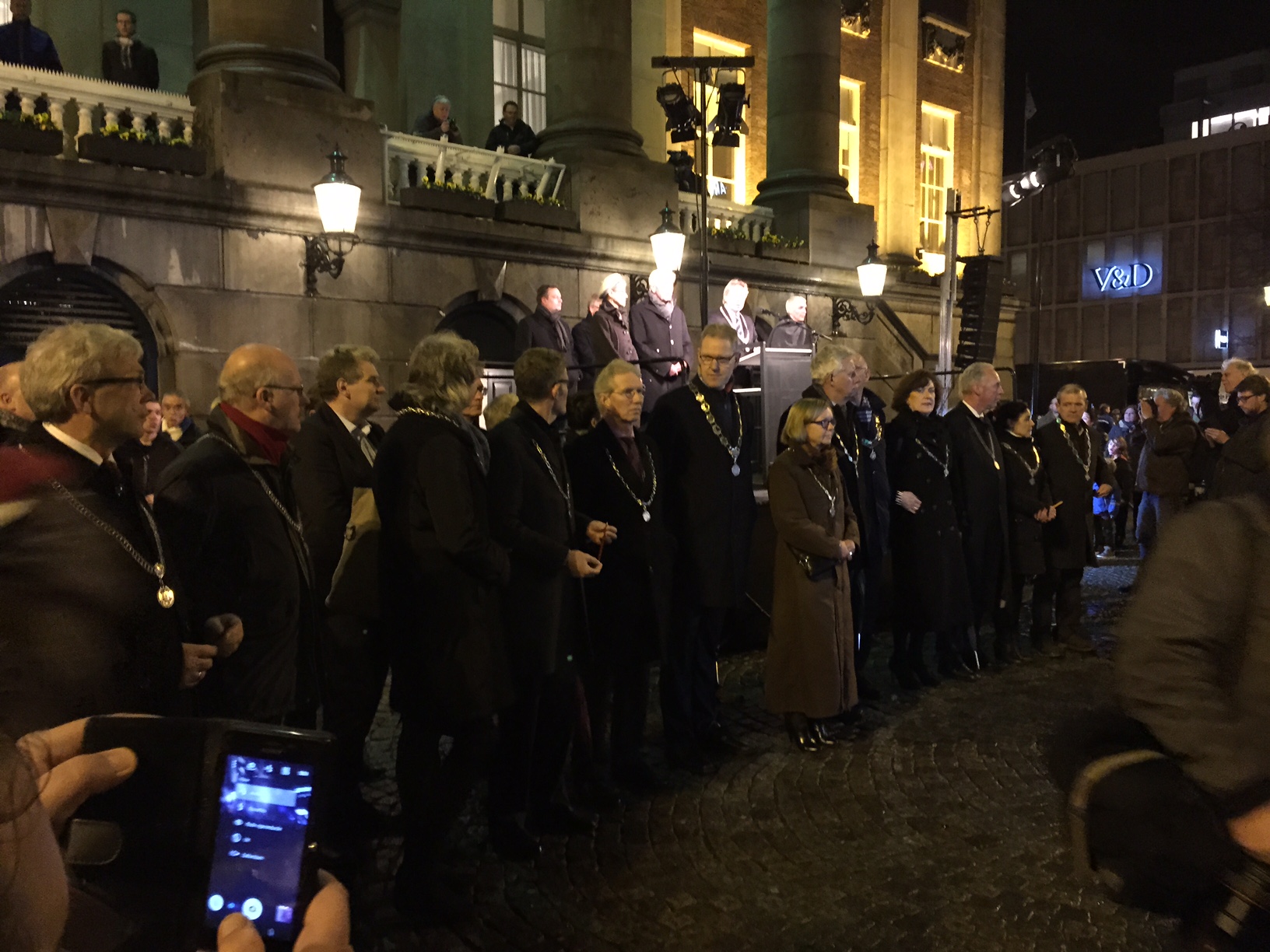 Behalve zo'n tweeduizend demonstranten zijn er ook veertien Groningse burgemeesters aanwezig. Burgemeester Peter den Oudsten nam als eerste het woord. ,,Vandaag zijn we allemaal Fransen", zei hij om de solidariteit met de Franse bevolking te tonen.