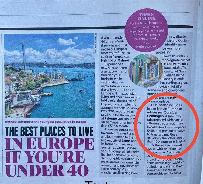 Daarna vervolgt het artikel: “Onze lijst bevat ook minder bekende Europese adressen. Neem bijvoorbeeld Groningen. Een kleine stad met kanalen die er kris kras doorheen gaan, die een jonger, leefbaarder ( en veel goedkoper) alternatief bieden voor Amsterdam. Plus een universiteit die meer dan honderd Engelstalige studies in het Engels aanbiedt’.