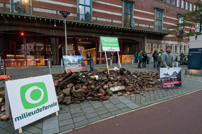 Gedupeerde Groningers en Milieudefensie hebben vanmorgen tien kuub puin van door de gaswinning vernielde monumentale boerderijen gestort op de stoep van het ministerie van Economische Zaken. Het maakt onderdeel uit van een speciaal ‘inwerkdossier gaswinning’ voor Eric Wiebes, de beoogd minister van Economische Zaken en Klimaat. ‘Wij staan hier op zijn eerste werkdag om te laten zien waar de Groningers dagelijks mee te maken hebben. 'Het versneld dichtdraaien van de gaskraan hoort bovenaan zijn prioriteitenlijst’, zegt Jorien de Lege van Milieudefensie.