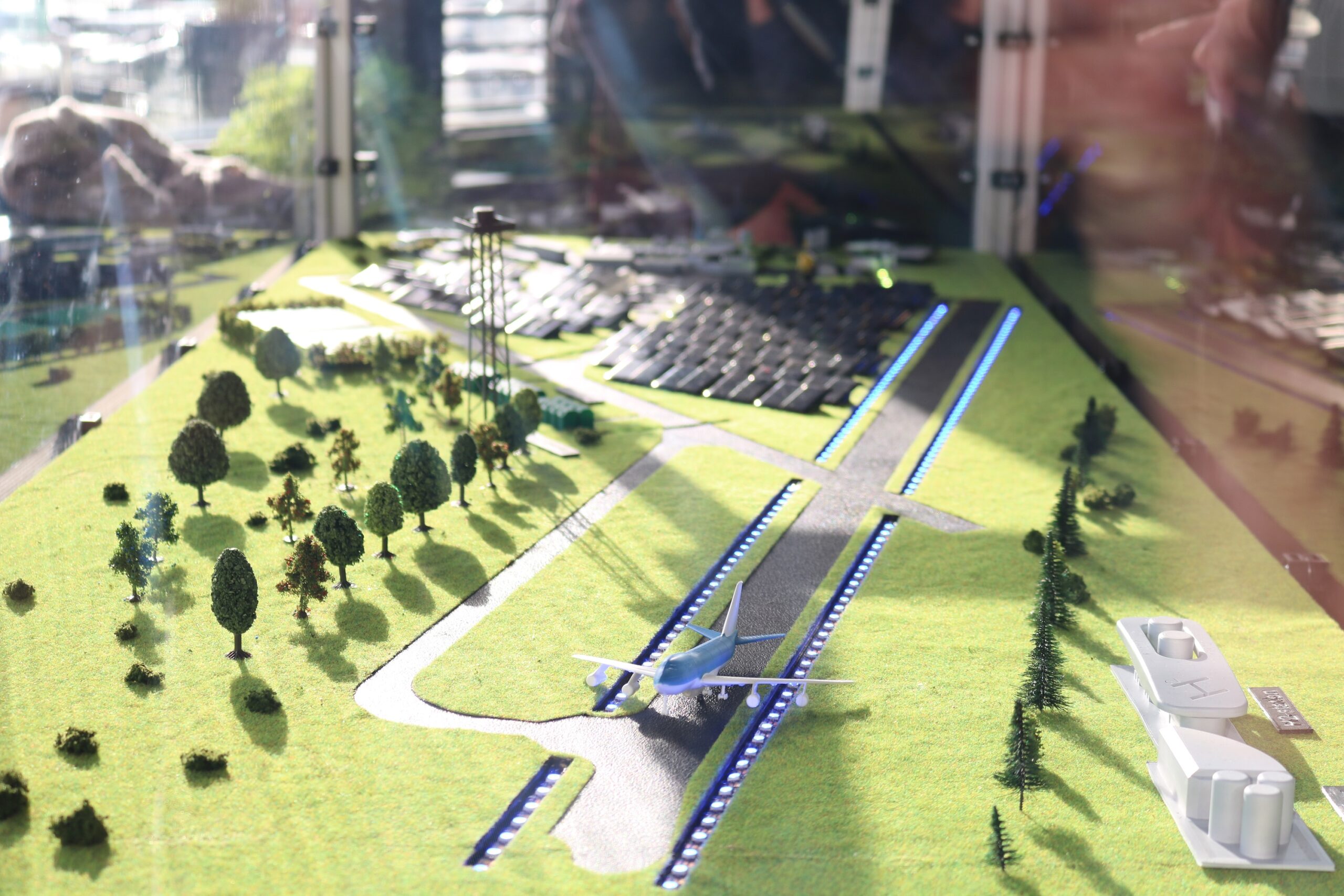 Het schaalmodel toont hoe groene stroom van het bestaande zonnepark op GAE omgezet wordt in waterstof en hoe het vervolgens wordt opgeslagen, gedistribueerd en afgenomen op de luchthaven.