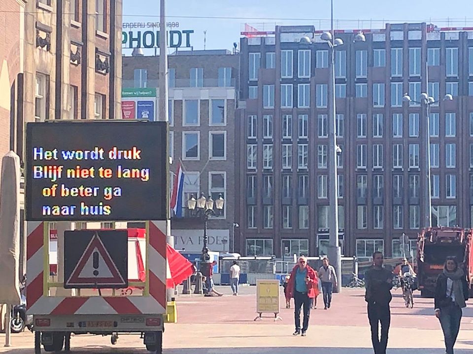 Tussen het Waagplein en de Herestraat staat een bord met een tekst in opdracht van de gemeente Groningen, met een wisselende tekst. “Houd afstand en bespaar een boete” en vervolgens, iets strenger: “Het wordt druk. Blijf niet te lang of beter ga naar huis”.