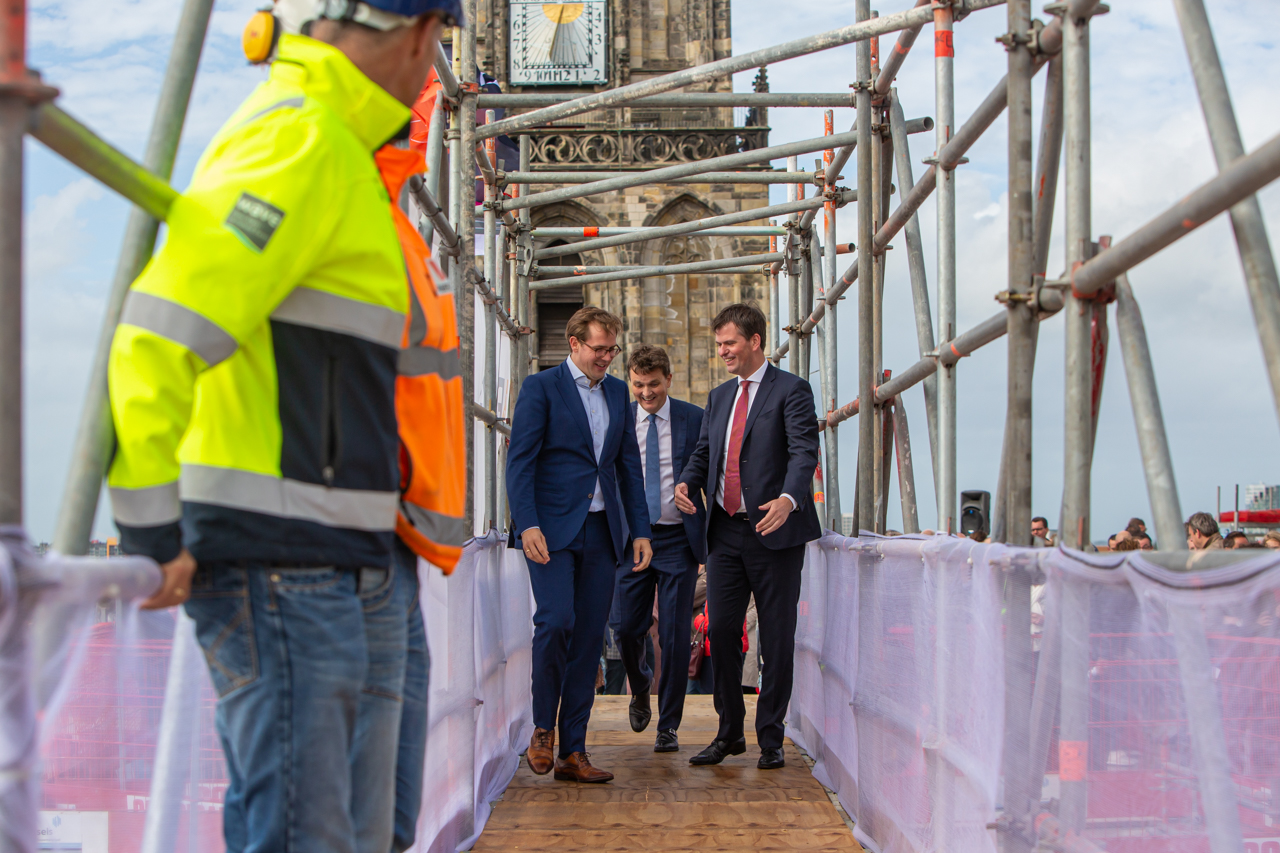 Foto onder: VLNR Wethouder Paul de Rook, Marcel Schipper, directeur VolkersWessels Vastgoed, Kristiaan Capelle, directeur MWPO lopen over de tijdelijke brug tussen het Westcord Market Hotel en Merckt.