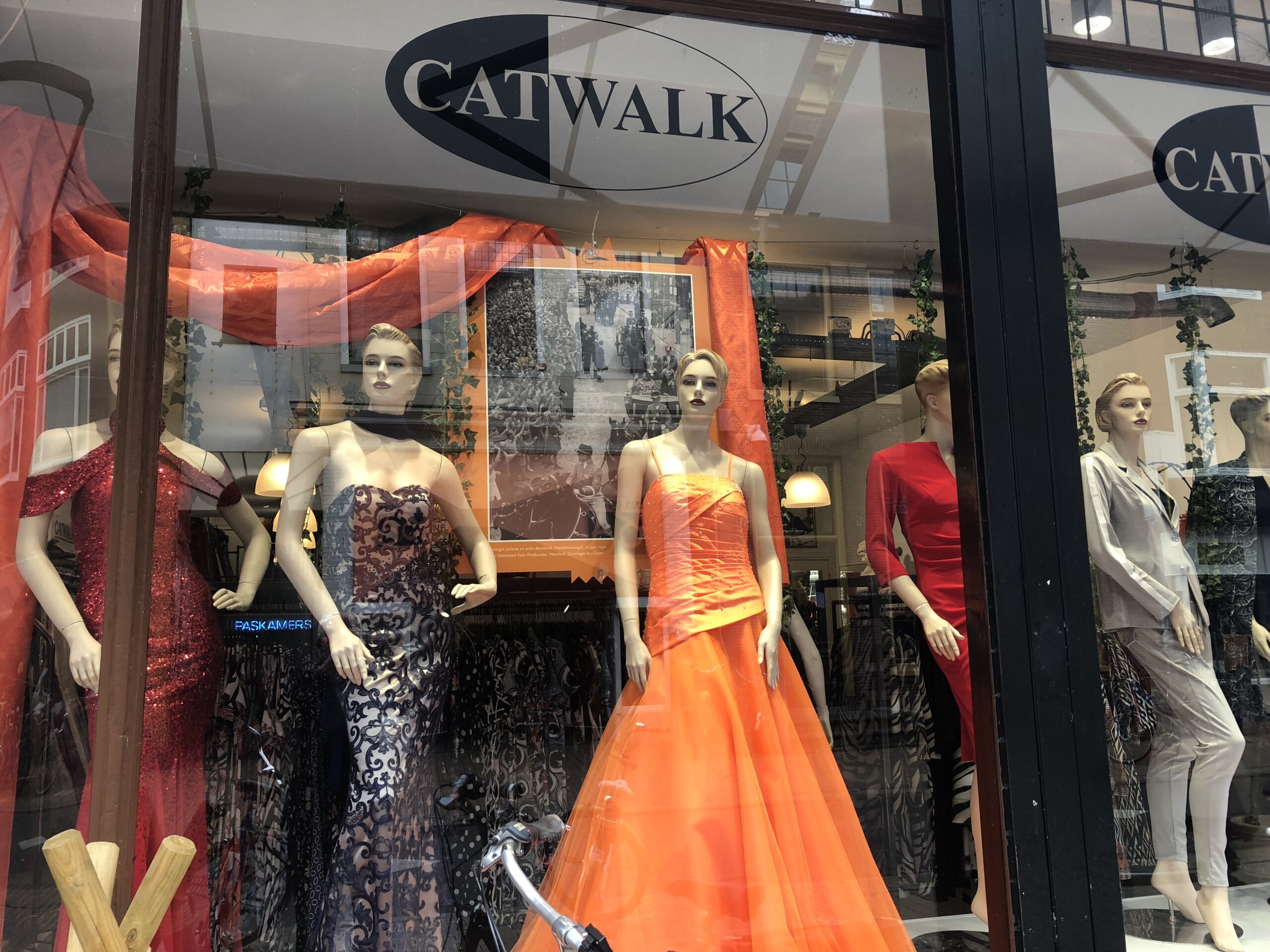 Overigens staan etalages in de gehele binnenstad in het teken van de komst van de koning, en van eerdere bezoeken van leden van het koningshuis, aan Groningen. De oranjekoorts begint nu echt wat op te lopen in de etalages, zoals ook te zien aan de oranje jurk van kledingzaak Catwalk in de Oosterstraat.