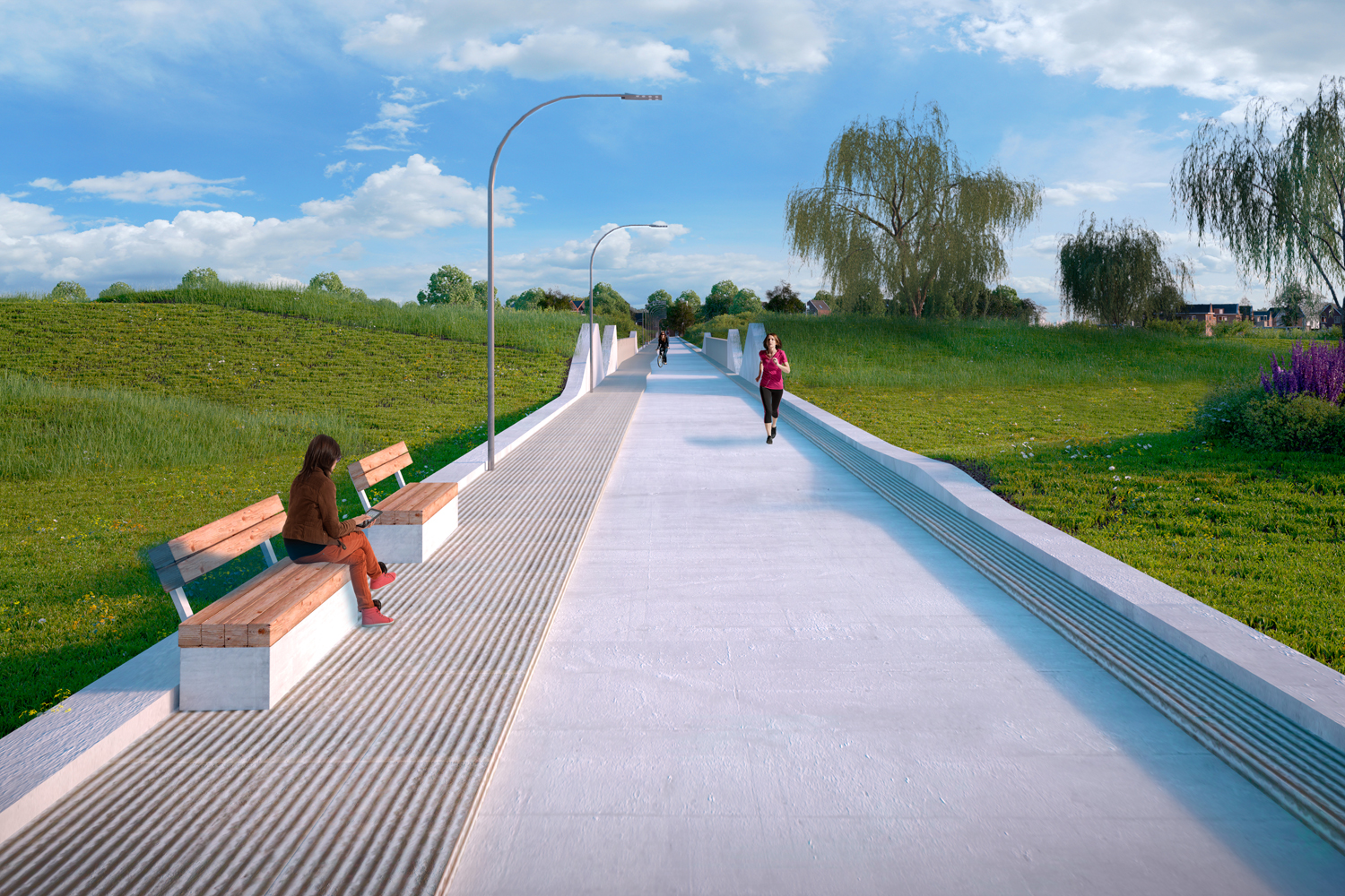 Het fietspad is een bijzonder element in het park. Het bijna witte en strak gelegde beton vormt een mooi contrast tegen de glooiende groene heuvels en zorgt voor een kunstzinnige onderbreking in het landschap. Met de voltooiing van het fietspad komt de afronding van het hele park ook steeds dichterbij. Op donderdag 5 september vierden de ontwerpers en betrokkenen de officiële opening van het fietspad samen met de Meerstadjers.