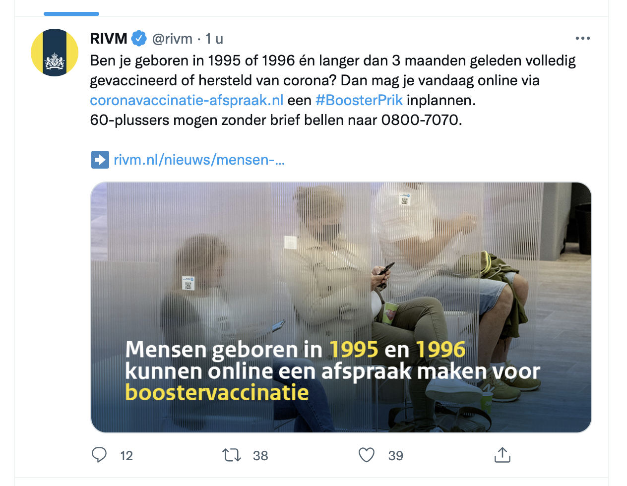 Het boosterprikken gaat hard. Mensen die geboren zijn in 1995 en 1996 kunnen vanaf vandaag een afspraak maken voor een boosterprik. Dat meldt het RIVM op Twitter.