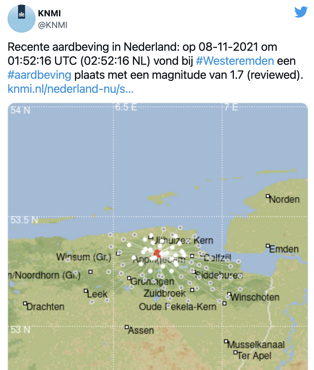 Nachtelijke aardbeving van 1.7 bij Westeremden