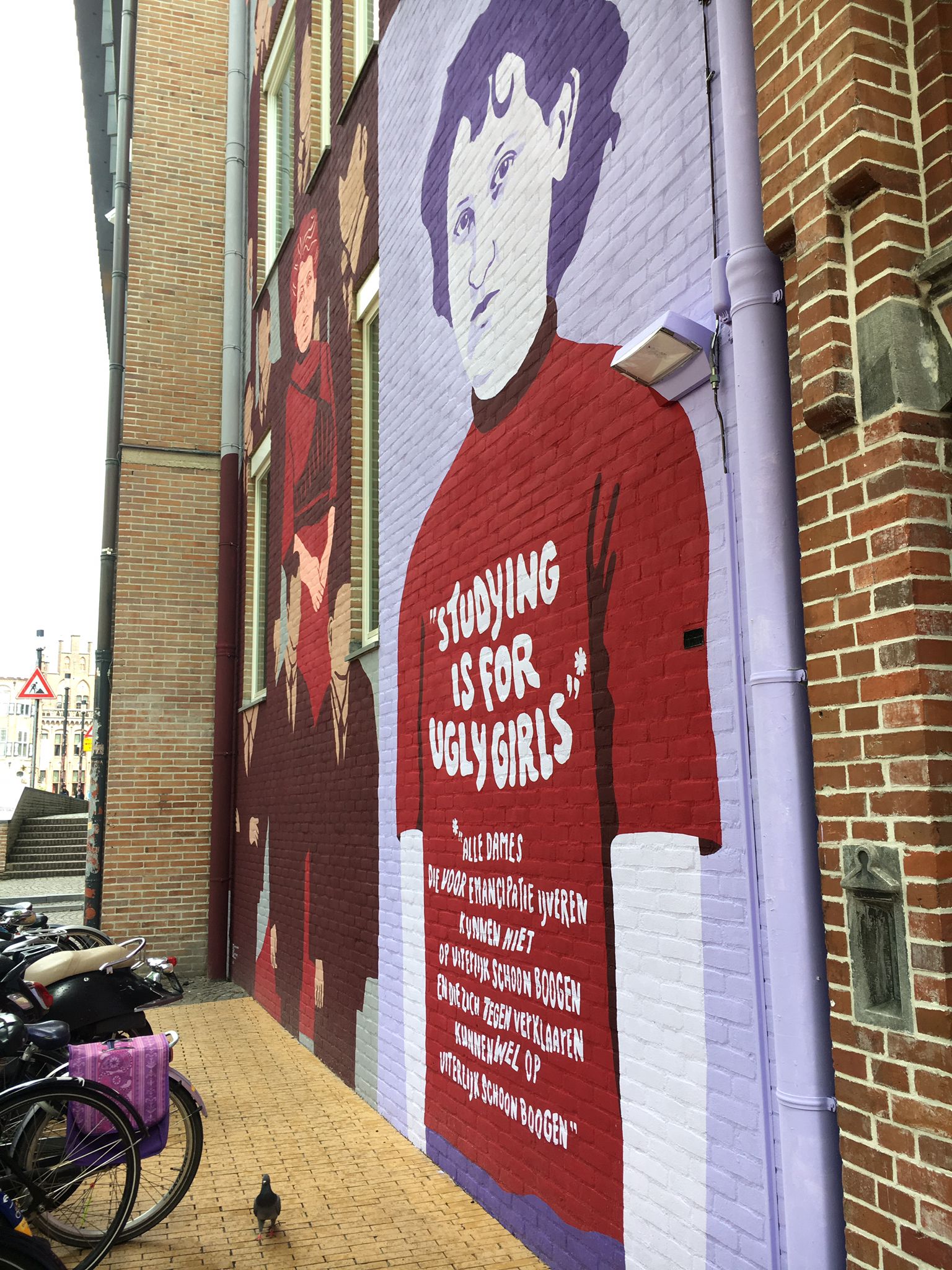 In de enorme muurschildering is Jacobs twee keer te zien. Een keer omringd door mannen en een keer met een T-shirt aan met de tekst ‘studying is for ugly girls’, een quote die destijds over Jacobs werd geschreven. Het duo ervaart dat vrouwen nog steeds op hun uiterlijk worden afgerekend en hebben het daarom in het kunstwerk verwerkt.