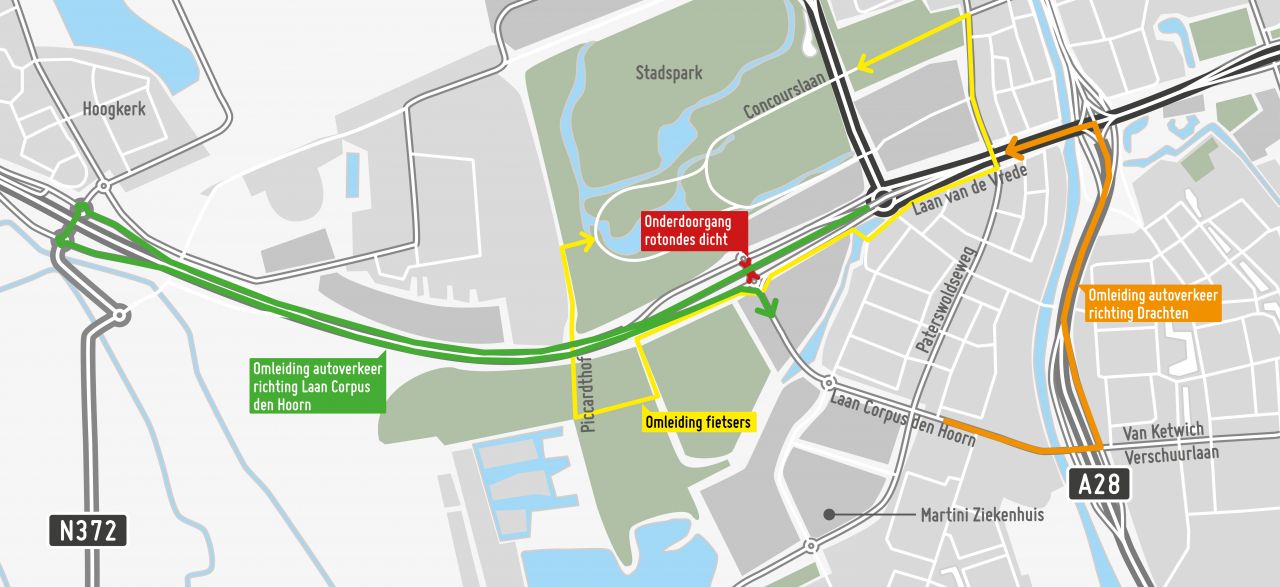 Autoverkeer vanaf de Laan Corpus den Hoorn richting Drachten wordt omgeleid via de A28 en het Julianaplein (op bovenstaand kaartje de oranje route).