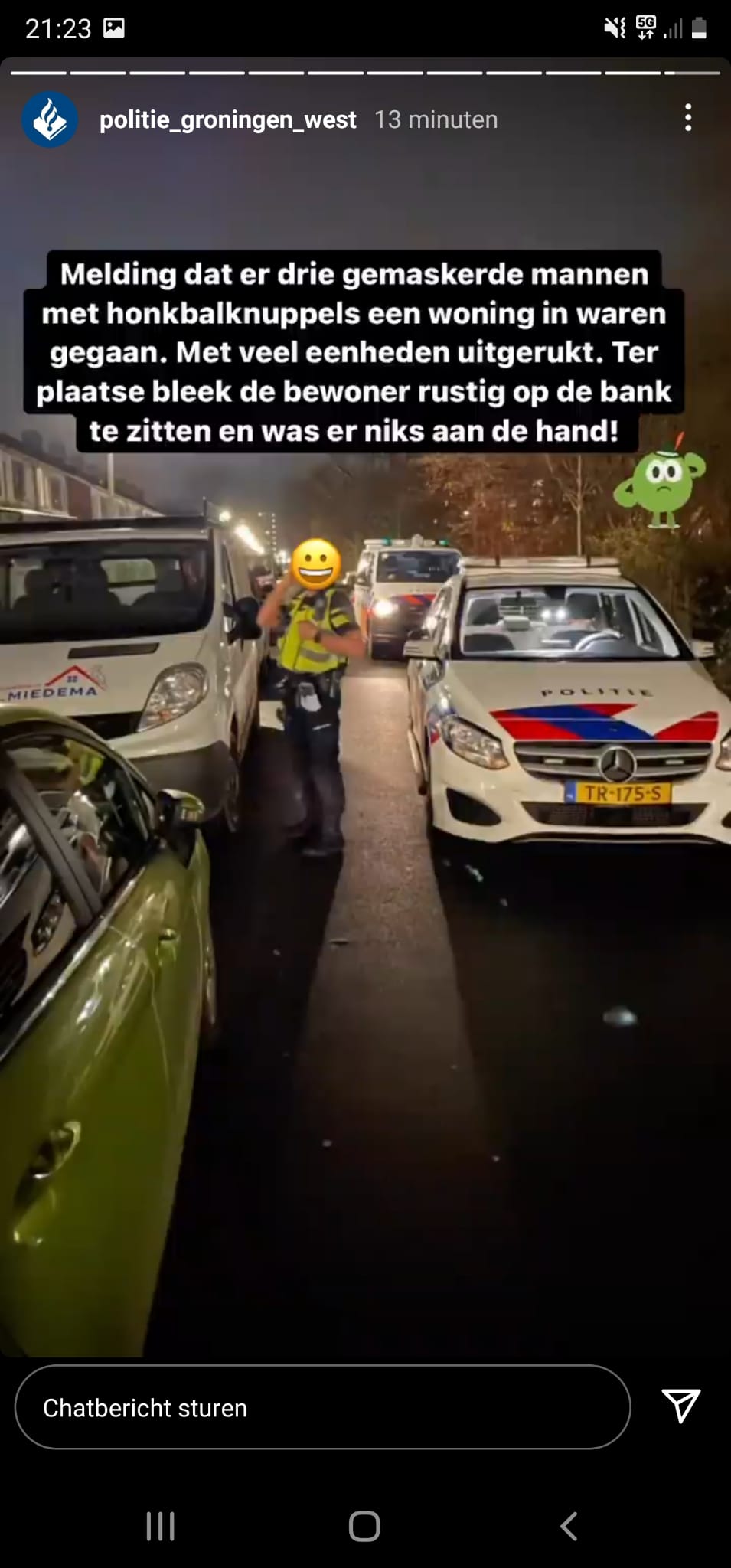 De politie rukte gisteravond met veel eenheden uit naar de Poolsterlaan na een melding dat er drie gemaskerde mannen met honkbalknuppels een woning binnen waren gegaan. Eenmaal ter plaatse bleek de bewoner van de bewoner van de woning rustig op de bank te zitten en was er niks aan de hand. Dat meldt de politie op Instagram.