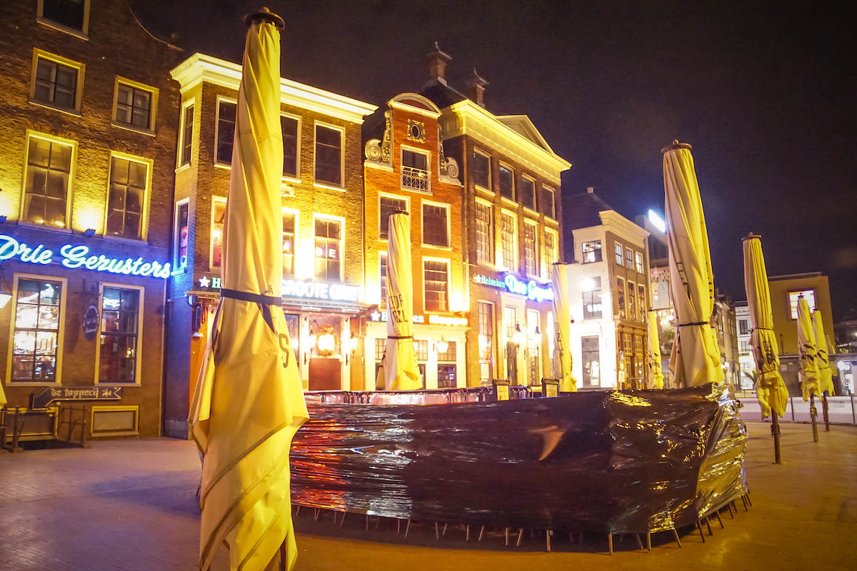 De horeca blijft in ieder geval de komende drie weken nog gesloten en dat is een bittere pil voor de ondernemers. De Drie Gezusters heeft het terras vast opgeruimd en in de Poelestraat en Peperstraat is 's avonds niemand te bekennen.
