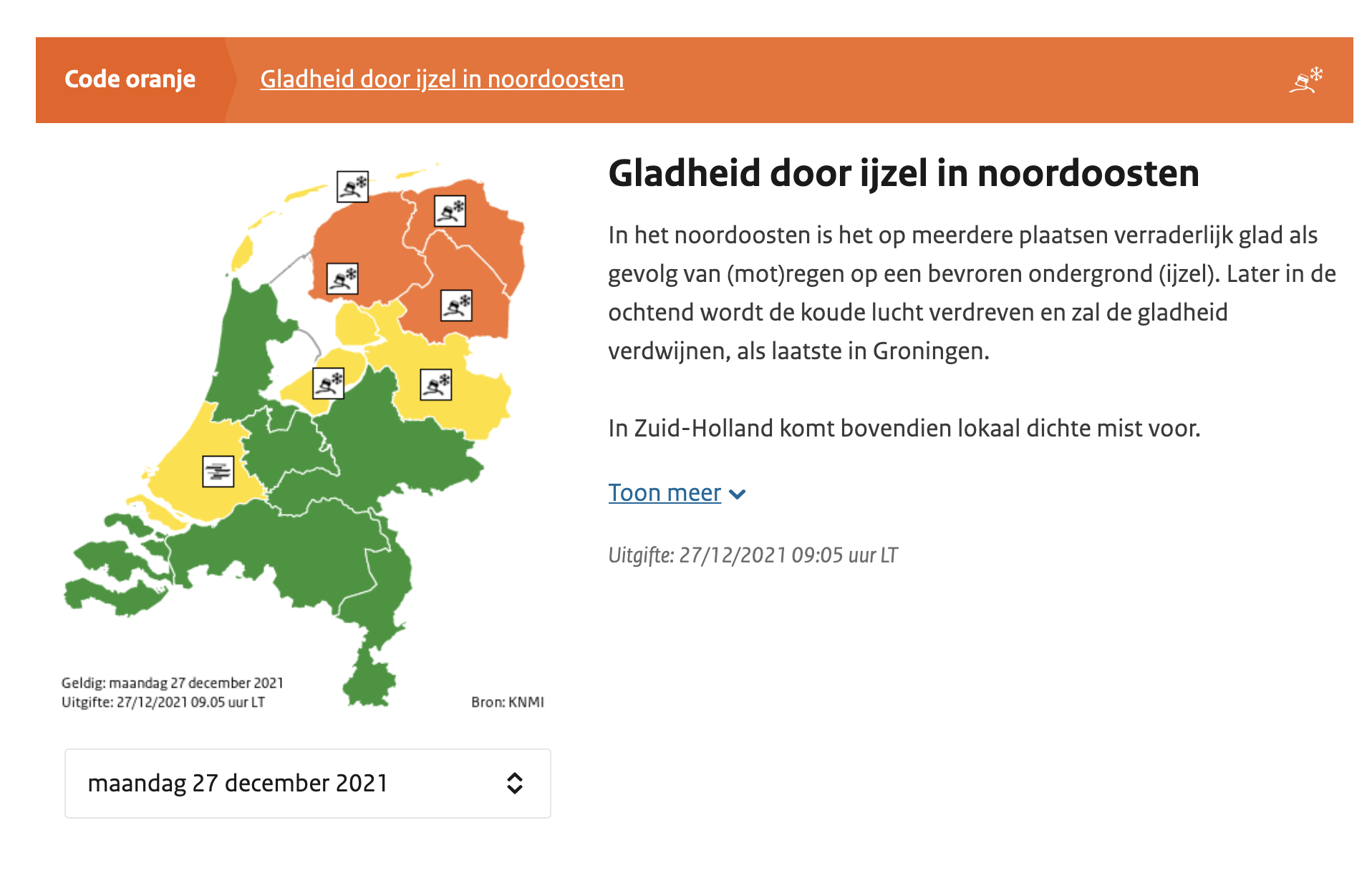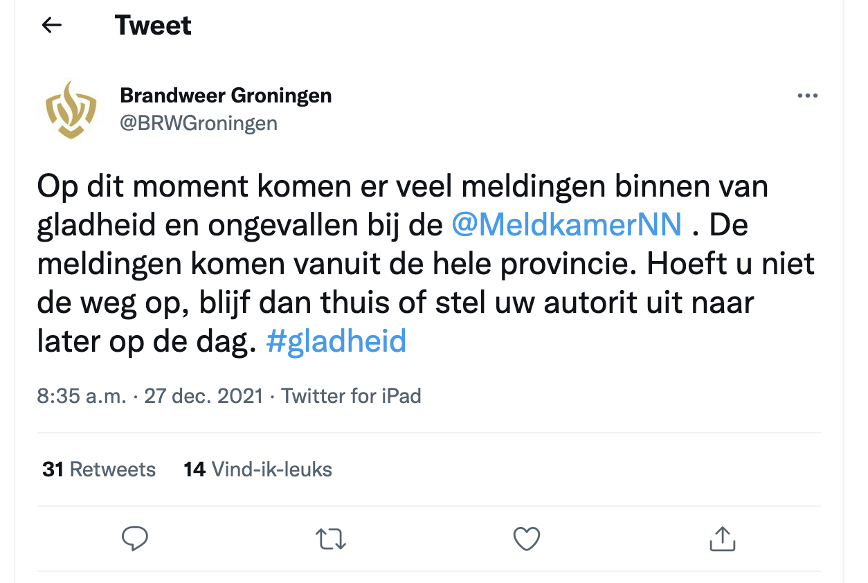 Strooiploegen zijn hard aan het werk om de wegen veilig te houden. In de loop van de dag zal de gladheid minder worden, omdat de temperatuur in de middag oploopt tot een paar graden boven nul. Ook komende nacht ligt de temperatuur boven het vriespunt.