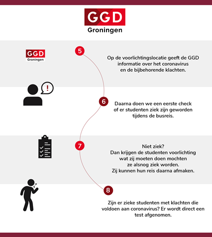 De GGD Groningen vond het belangrijk om de studenten goed te informeren over wat te moeten doen in het geval ze alsnog ziekteverschijnselen krijgen die te relateren zijn aan het Corona-virus. Daarom kregen ze voorlichting over hoe ze de juiste voorzorgsmaatregelen kunnen nemen.