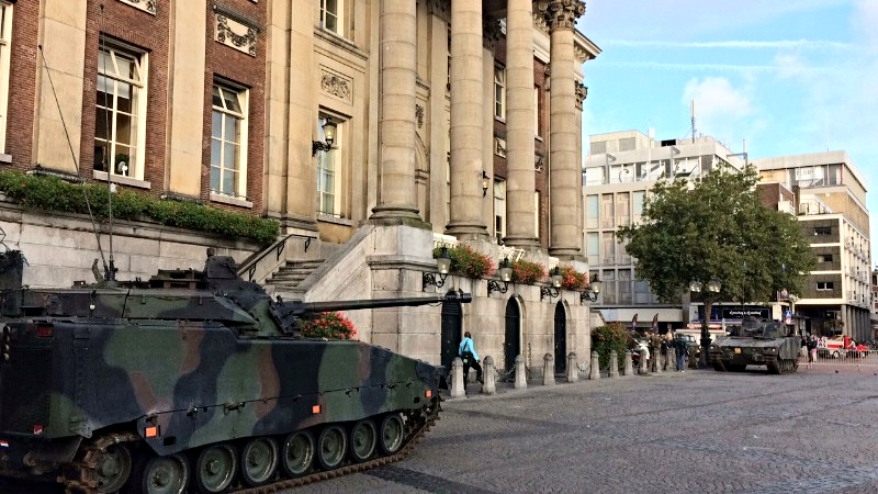 Er zijn op de Grote Markt de hele dag verschillende militaire voertuigen te bewonderen, waaronder het hightech pantservoertuig CV90, de Boxer ambulance en het verkenningsvoertuig Fennek.