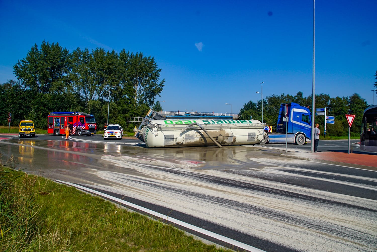 Het is nog onbekend hoe het kan dat de trailer is gekanteld. Ook is nog onduidelijk of er gewonden zijn gevallen. De brandweer is opgeroepen omdat er mogelijk gevaarlijke stoffen betrokken zijn.