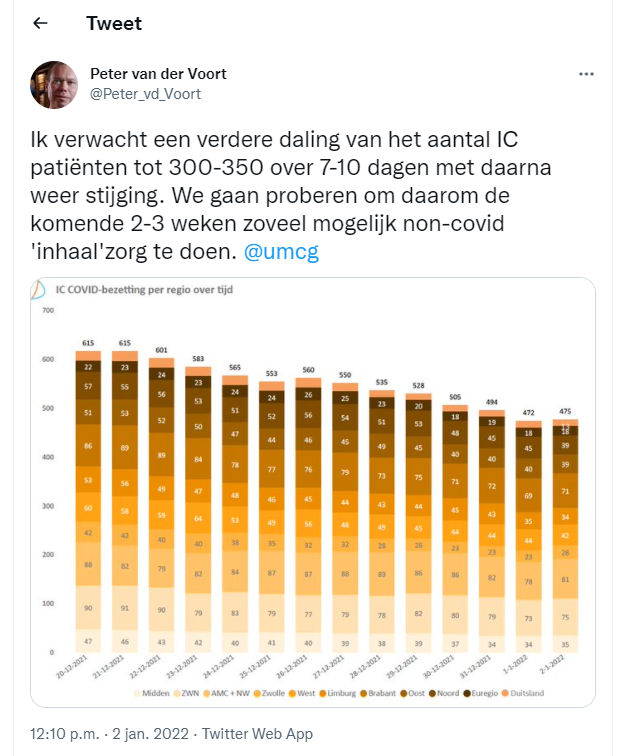 Op een vraag van een andere Twitteraar of dat bij de Omicronvariant ook zo is, reageert hij: “Ik weet niet of dat met Omicron ook zo is. Ik ben ook klaar met de paniek. Daarom hoop ik op een duidelijk stabiel beleid met visie waarmee we allemaal weten waar we aan toe zijn. Dat heeft ieder mens en de ic nodig.”