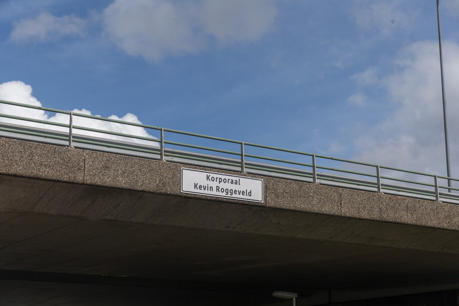 Burgemeester Koen Schuiling, nabestaanden en vertegenwoordigers van de landmacht legden vrijdagmiddag bloemen bij het "Korporaal Kevin Roggeveld-viaduct".