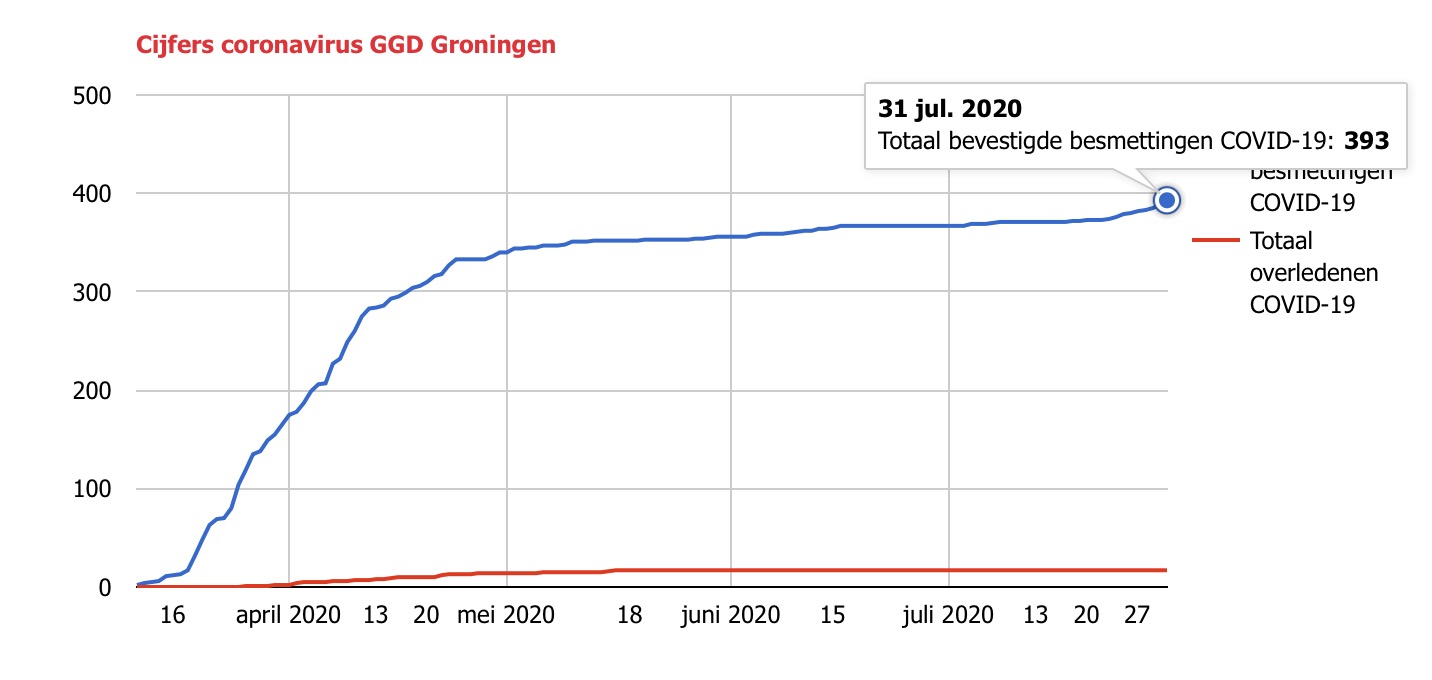 Op de website van de GGD is te zien dat het aantal tussen 30 en 31 juli steeg van 388 naar 393. Dat zijn er zeventien meer dan een week eerder. Het virus wint nu dus ook in de provincie Groningen weer wat meer aan kracht. De extra besmettingen hebben nog niet geleid tot een ziekenhuisopname of een sterfgeval.