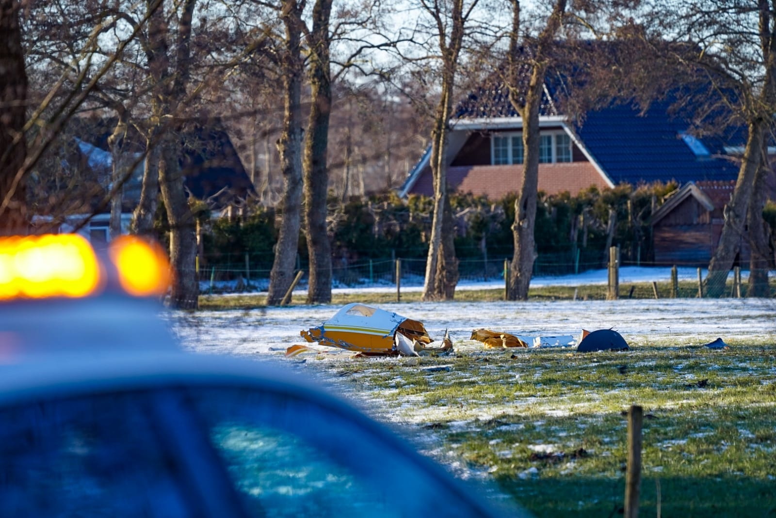 De politie zette een helicopter ingezet om beelden te maken van het verongelukte vliegtuig en van het weiland.