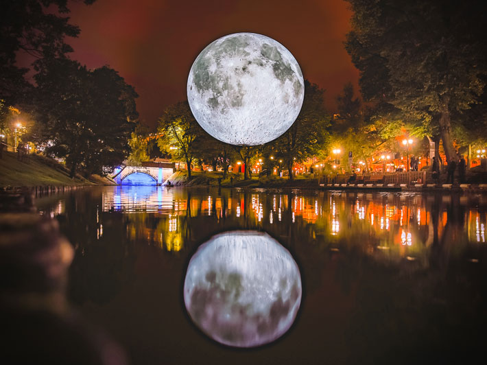 Het gaat om een kunstwerk van de Engelse kunstenaar Luke Jerram. De maan, Museum of the Moon, is van binnen verlicht waardoor het oppervlak goed tot zijn recht komt. De maan is een schaalmodel. Elke centimeter van de maan van Jerram is in het echt vijf kilometer.
