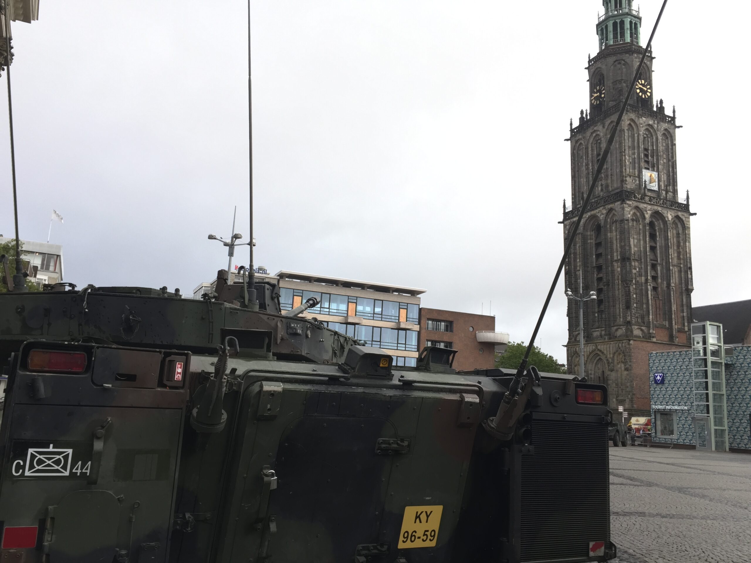 De voertuigen staan op de Grote Markt in verband met de beediging van nieuwe militairen van de Johan Willem Friso Kazerne uit Havelte.