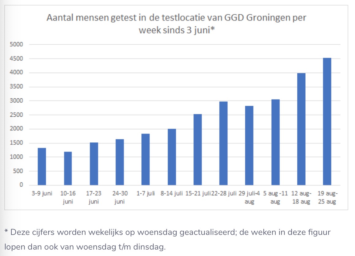 Opvallend is dat het aantal coronatesten op de testlocatie in Groningen opnieuw fors is gestegen. Tussen 19 en 25 augustus werden daar 4.525 personen getest op het virus. Daarvan waren er 27 positief en dat is een percentage van 0,6 procent. Vorige week werden er 3.983 mensen getest en dat was alweer bijna duizend meer dan de week daarvoor. Het percentage positieve testen lag vorige week nog op 1,0 procent.