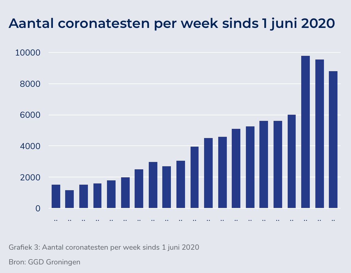 In de afgelopen week (week 43) werden er 8.830 mensen getest op de GGD-testlocaties bij het UMCG, aan de Europaweg in Groningen, in Veendam, Delfzijl en Grijpskerk. Hiervan werden er 677 (7,7%) positief getest. De doorlooptijd van aanmelding tot uitslag wordt daarbij gelukkig korter (testafname kan inmiddels meestal op de dag van aanmelding plaatsvinden). Het aantal coronatesten is lager dan een week eerder (9.557 testen) en ook het aantal positieve testen is lager dan vorige week. Toen bleken 786 mensen positief (8,2 procent).