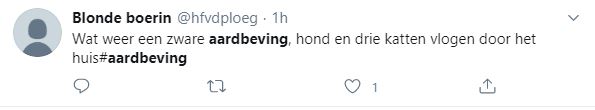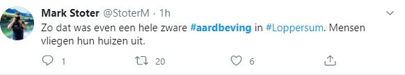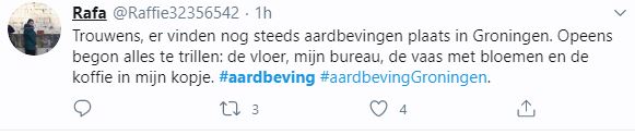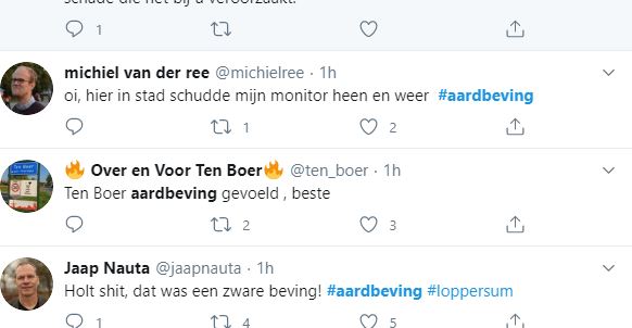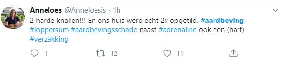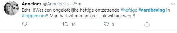 Anneloes uit Loppersum meldt op twitter dat er sprake was van een ontzettende heftige aardbeving ‘mijn hart zit in mijn keel … ik wil hier weg!!!