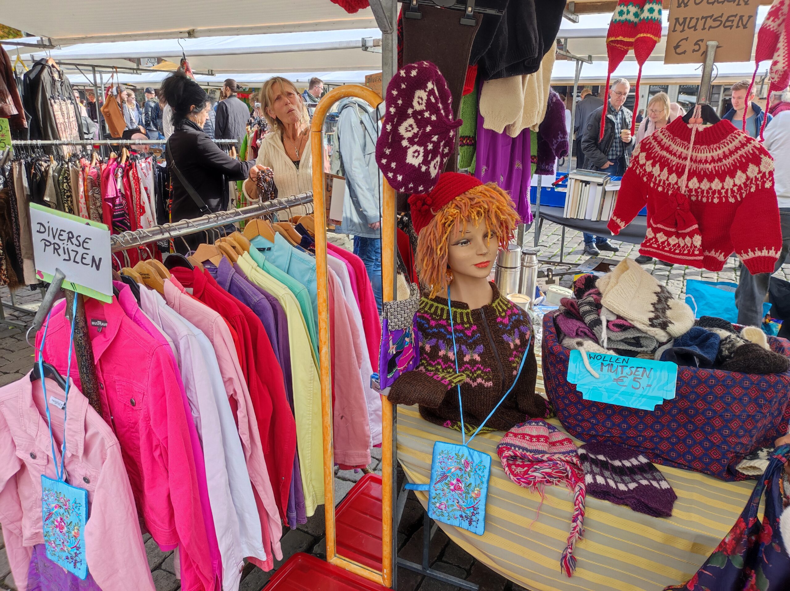 Op de markt is van alles te koop, variërend van vintage kleding tot prenten tot kinderspeelgoed en van vinyl tot boeken tot servies. Veel Duitsers zullen aan het eind van de dag ongetwijfeld voldaan de tocht naar huis hebben gemaakt na hun bezoek aan Groningen.