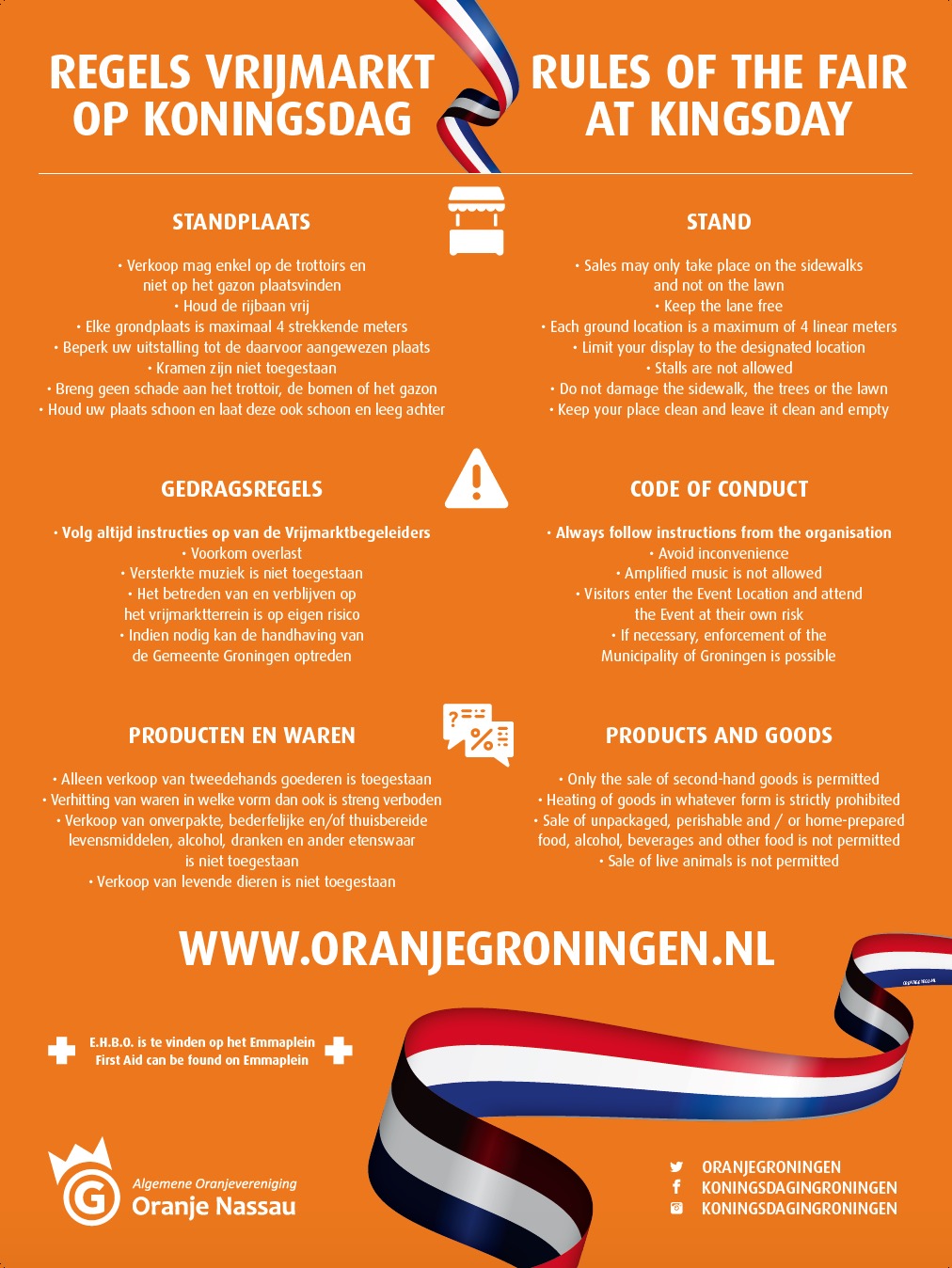 De Oranjevrijmarkt is dit jaar aan de Ubbo Emmiussingel, Praediniussingel, Ganzevoortsingel en Coehoornsingel, vanaf 7 uur kan een plekje gezocht worden en start de verkoop vanaf 9:00 uur tot 17:00 uur. De organisatie verzoekt de standhouders, verkopers, kleedjeshouders, zich goed te houden aan de regels die voor de vrijmarkt (zie hieronder) gelden. Dit om teleurstellingen te voorkomen. De regels voor de vrijmarkt zijn dit jaar in twee talen om iederen goed op de hoogte kunnen brengen.