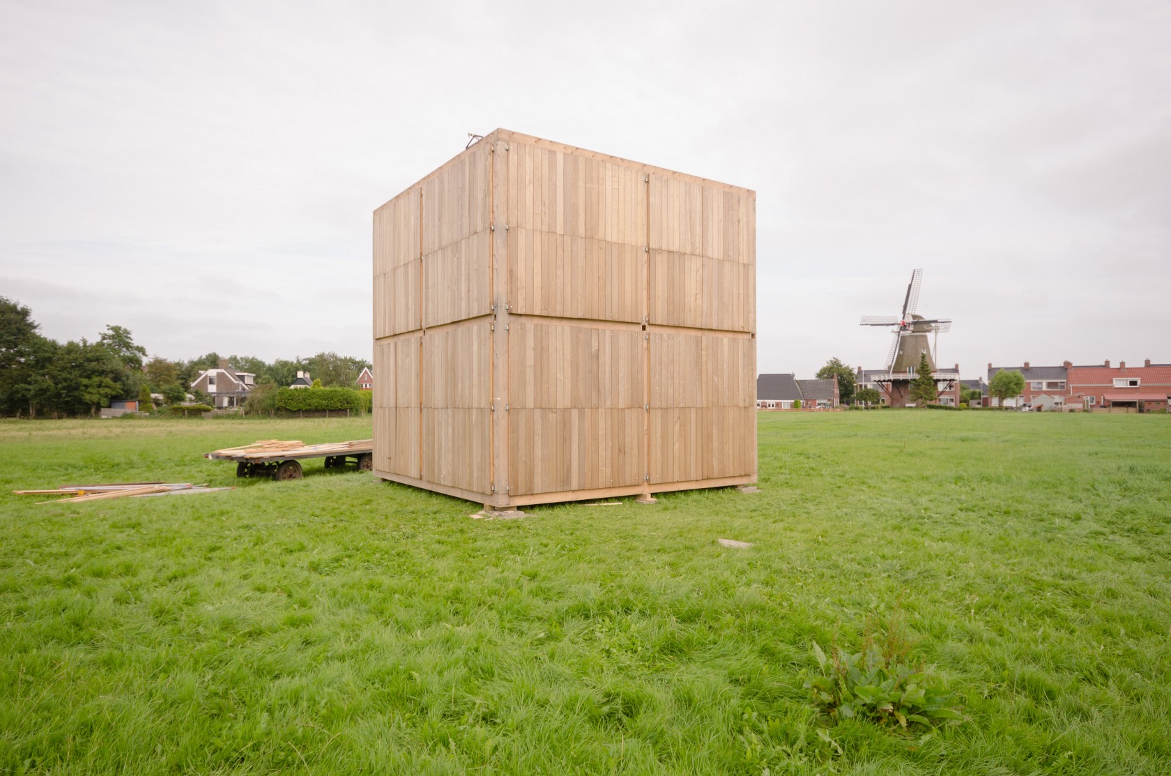 De grote houten kubus (6x6x6 meter) is deze week opgebouwd achter de molen 'Germania', middenin het dorp. Daar speelt van 3 t/m 20 september voorstelling 'De Omslag', over het leven van kunstenaar H.N. Werkman. Ook zijn er diverse workshops, o.a. over fotografie en soep maken.