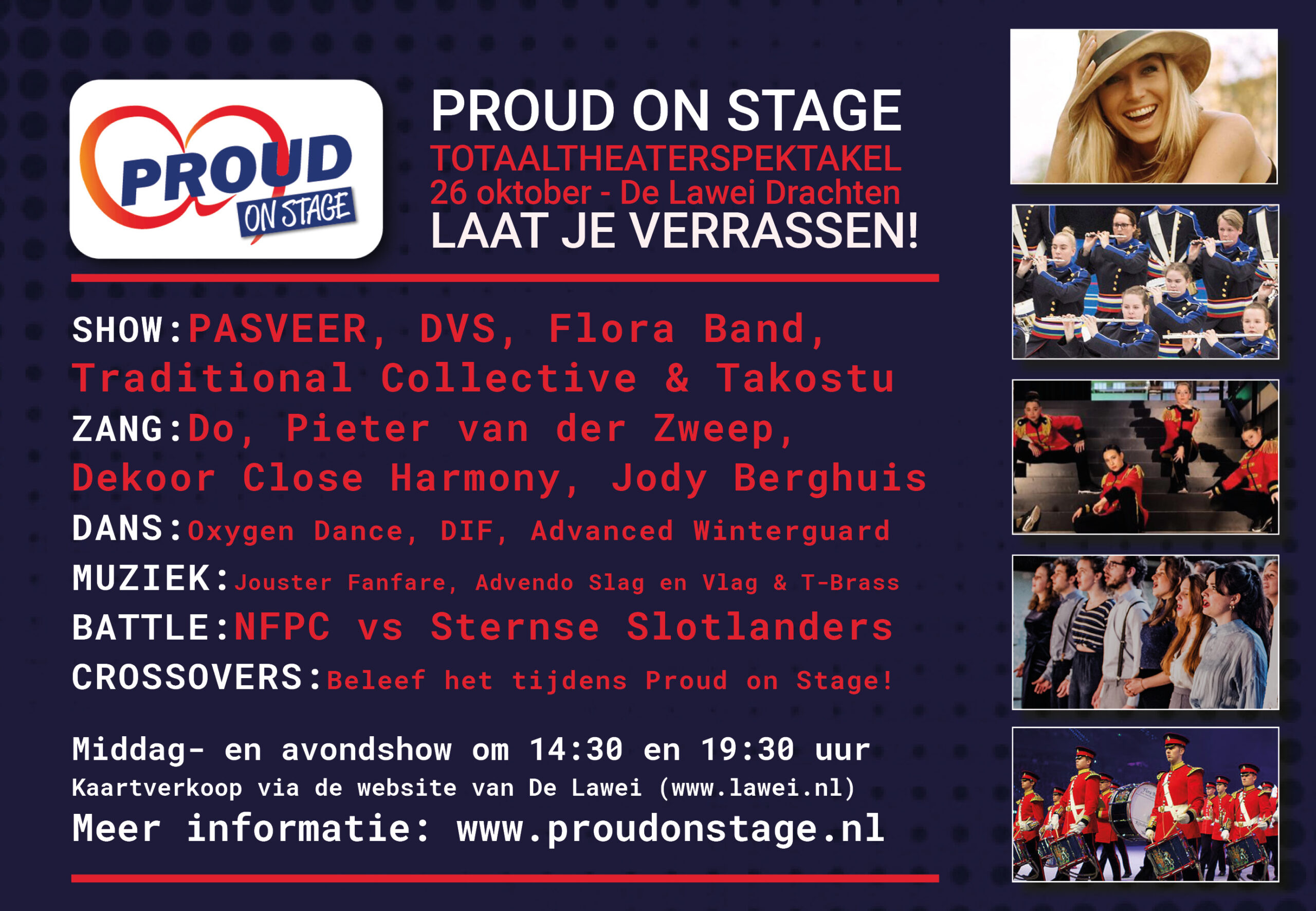 Na twee edities in De Harmonie, waarvan de laatste was uitverkocht, is Proud on Stage nu exclusief in De Lawei te zien. Op zaterdag 26 oktober staan twee identieke voorstellingen op het programma om 14.30 en 19.30 uur. Kaarten kosten nu 17,50 euro (normaal 25 euro). Bezoekers kunnen via de website van De Lawei hun eigen stoel reserveren. Er zijn nog kaarten beschikbaar voor de middag- en avondvoorstelling. Meer informatie is ook te vinden op www.proudonstage.nl.