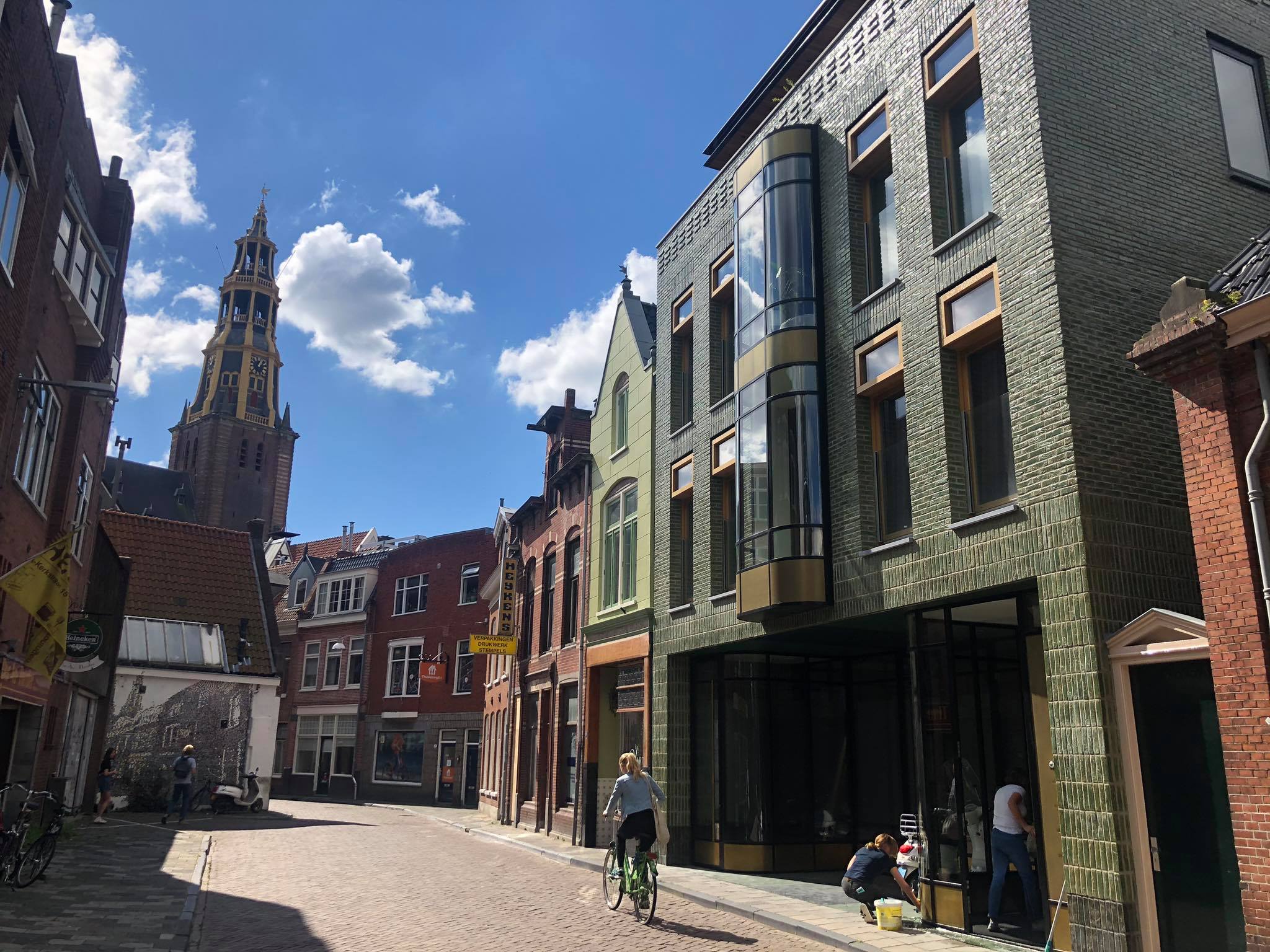 Eén van de veertig projecten is dus het gebouw op bijstaande foto’s. Het Amsterdamse bureau &Prast&Hooft ontwierp aan de Akerkstraat een gebouw met horeca op de begane grond en drie grote appartementen op de verdiepingen. Het pand is ontworpen met volledige rekenschap van de bebouwde omgeving.