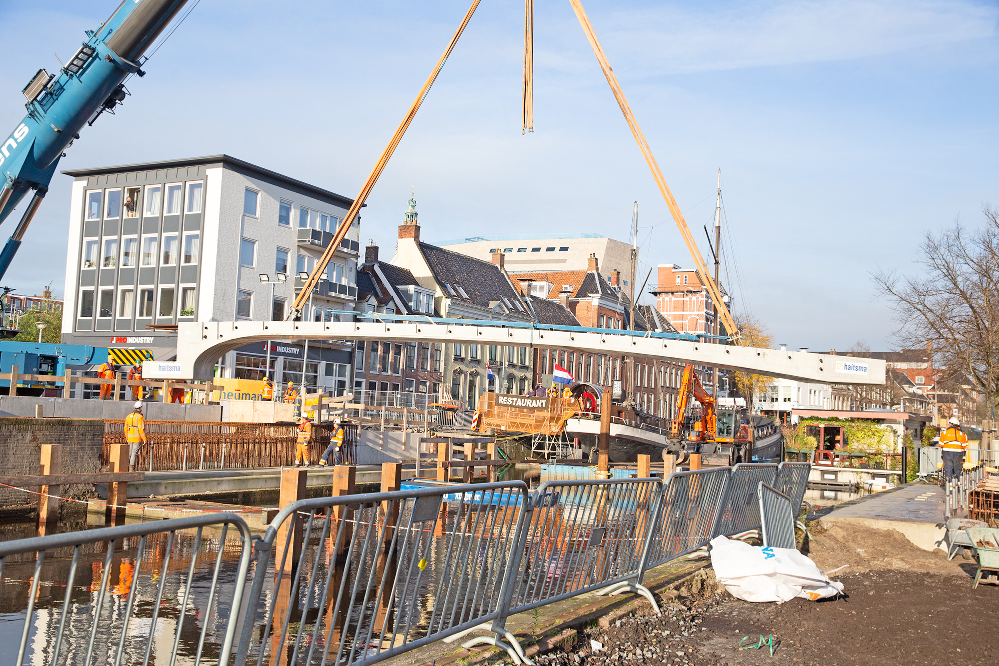 | Vorige week werden zeven brugliggers geplaatst tussen de beide landhoofden aan weerszijden van het Schuitendiep. Naast elkaar gelegd vormen ze samen het brugdek. De komende maanden wordt gewerkt aan de afbouw. Ook het groen is al gepland. Naar verwachting half februari rijden de bussen voor het eerst over de nieuwe brug. |