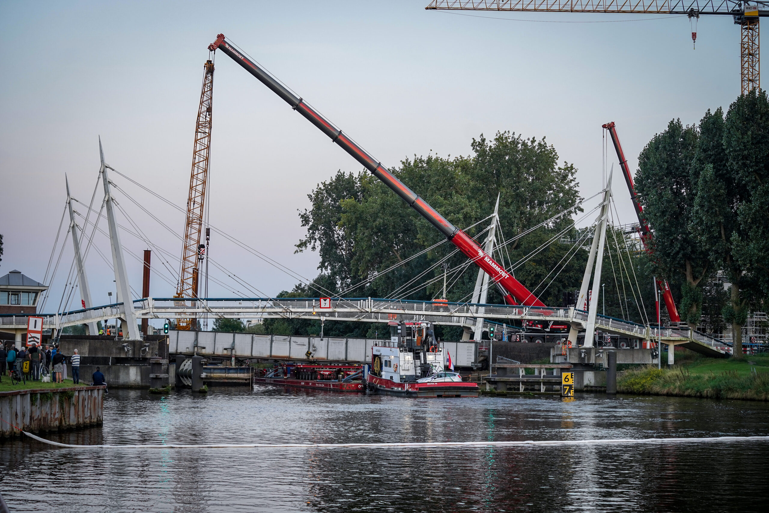 Er stonden meerdere zware hijskranen om het beweegbare deel van de brug op een ponton te hijsen. De ponton brengt de brug naar een werf voor nader onderzoek.