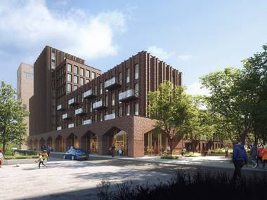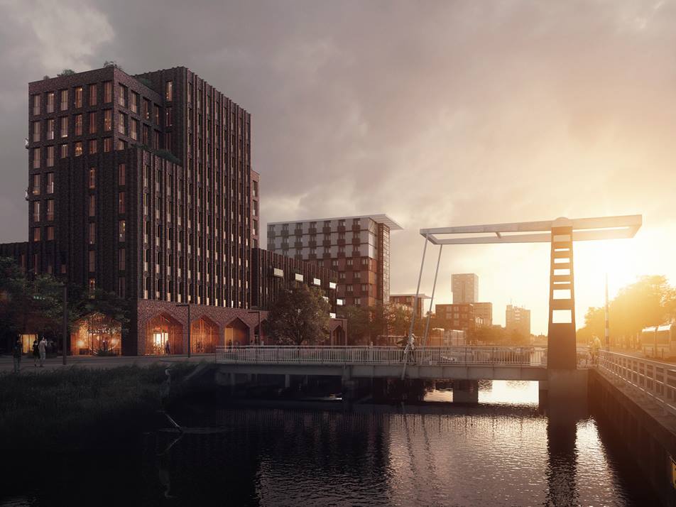 Nieuwbouwcomplex Karaat vormt met zijn woontoren, hoogteverschillen en goudkleurige accenten straks een nieuwe blikvanger aan de kade.