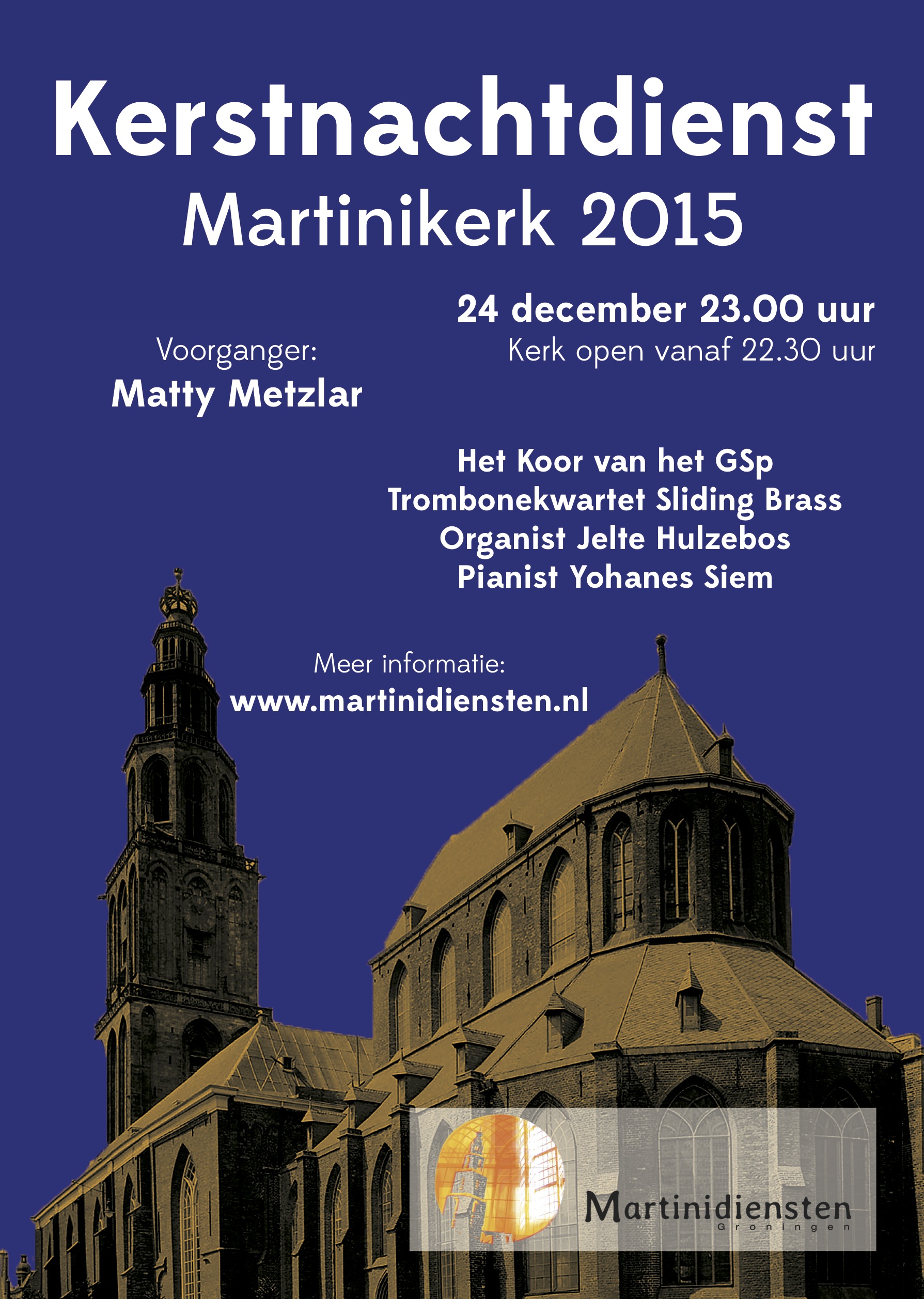 Op donderdag 24 december vindt om 23.00 uur in de Martinikerk de traditionele kerstnachtdienst plaats met bekende en minder bekende kerstliederen en muziek van trombonekwartet Sliding Brass. Voorganger is Matty Metzlar van het GSp-Studentenplatform voor Levensbeschouwing. Jelte Hulzebos bespeelt het Martini-orgel, pianist is Yohanes Siem en het Koor van het GSp staat onder leiding van Ton Tromp.