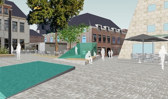 Op het terras aan de achterzijde van 't Feithhuis is de aannemer gestart met het aanleggen van de natuursteen elementen. De werkzaamheden worden in fasen uitgevoerd van west naar oost (van Grote Markt naar Schoolstraat).